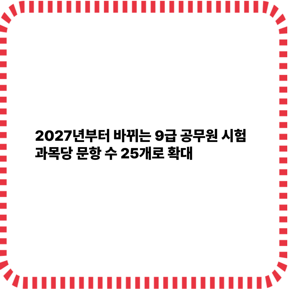 안녕하세요. 오늘은 9급 공무원 시험을 준비하고 있는 수험생 분들께 중요한 소식을 알려드리려 합니다. 인사혁신처는 2027년부터 9급 공채 필기시험 문항 수를 과목당 25문항으로 확대한다고 밝혔습니다.지금까지는 과목당 20문항, 총 5과목 100문항이었지만, 앞으로는 125문항으로 늘어나게 됩니다. 즉, 수험생이 풀어야 할 문제 수가 더 많아지고, 시험 준비 전략에도 변화가 필요하다는 뜻입니다. 📌 기존 시험 구조 vs 2027년 변경안 비교아래 표는 현재 시행 중인 2025년, 2026년 시험 구조와 2027년부터 시행될 변경 내용을 비교한 것입니다.구분2025~2026년2027년 이후과목 수5과목5과목과목별 문항 수20문항25문항총 문항 수100문항125문항시험 시간100분125분 (예상)현재까지..