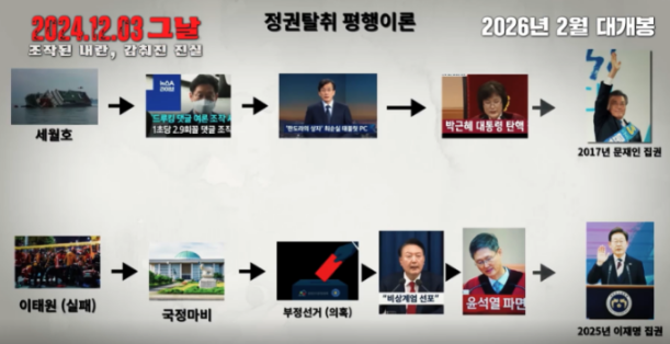 ■영화는 당시의 계엄 선토를 전혀 다른 시각에서 조명하며, 정치적으로 매우 논쟁적인 관점을 제시하고 있습니다. 이 다큐멘터리는 더콘텐츠메이커에서 제작했으며, 2024년 12월 3일 밤 윤석열 전 대통령이 선포한 비상계엄을 중심 소재로 삼고 있습니다. 영화는 기존 언론 보도와 방송 화면을 주요 자료로 활용하고, 극우 성향 유튜버들과 변호사, 헌법학자 등의 인터뷰를 통해서 서사를 구성했다는 게 이 영화에 특징입니다. 이영돈 PD가 사회처럼 진행하는 형식을 취하고 있어, 과거 그가 제작했던 시사 프로그램의 형식을 연상시킨다는 평가를 받고 있습니다. 영화의 핵심 메시지는 "12.3 비상계엄은 실패한 쿠데타가 아니라 치밀하게 설계된 덫"이라는 것입니다. 구체적으로 박근혜 전 대통령과 윤석열 전 대통령에 대한 두 번의 탄핵이 모두 민주당의 정권 탈환 시나리오에 따른 결과라고 주장합니다. 특히 입법 독재와 사법의 정치화가 만들어낸 '합법적 탄핵'의 이면을 추적하며, 두 대통령을 감옥으로 평행이론의 실체를 파헤친다고 강조하고 있습니다.