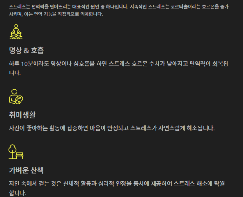 스트레스는 면역력을 떨어뜨리는 대표적인 원인 중 하나입니다. 지속적인 스트레스는 코르티솔이라는 호르몬을 증가시키며, 이는 면역 기능을 억제합니다.따라서 명상, 취미생활, 가벼운 산책 등을 통해 스트레스를 해소하는 것이 필요합니다. 자신만의 스트레스 해소 방법을 찾는 것이 면역력 관리에 큰 도움이 됩니다.