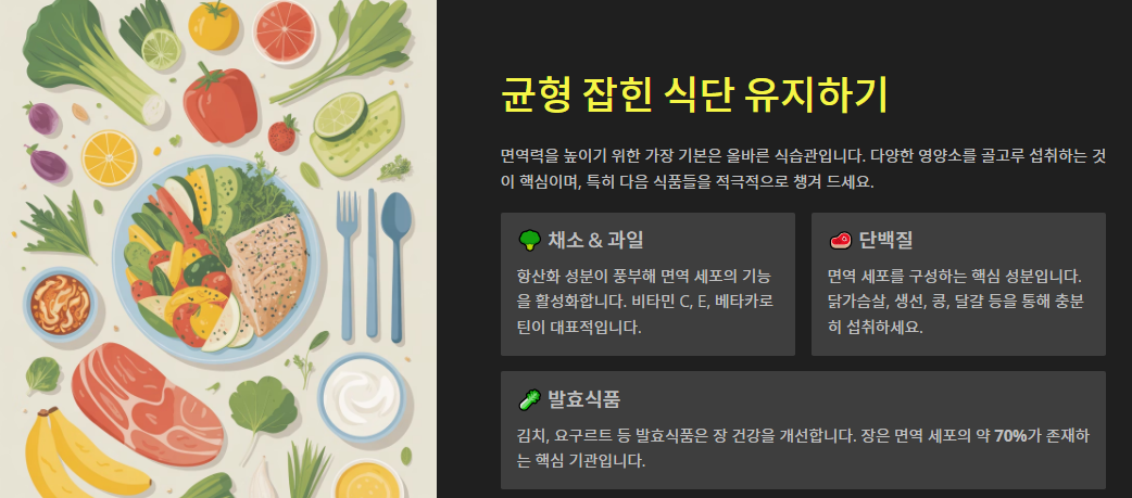 면역력을 높이기 위해 가장 기본이 되는 것은 바로 식습관입니다. 다양한 영양소를 골고루 섭취하는 것이 중요하며, 특히 비타민과 미네랄이 풍부한 음식이 도움이 됩니다. 채소와 과일에는 항산화 성분이 풍부해 면역 세포의 기능을 활성화시키며, 단백질은 면역 세포를 구성하는 중요한 요소입니다. 또한 발효식품(김치, 요구르트 등)은 장 건강을 개선하여 면역력 강화에 큰 도움을 줍니다. 장은 면역 세포의 약 70%가 존재하는 중요한 기관이기 때문에 장 건강 관리가 곧 면역력 관리라고 볼 수 있습니다.