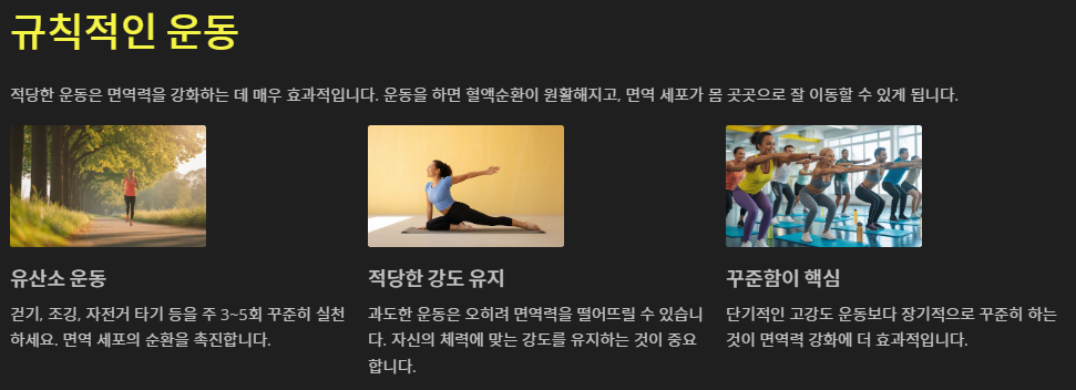 적당한 운동은 면역력을 강화하는 데 매우 효과적입니다. 운동을 하면 혈액순환이 원활해지고, 면역 세포가 몸 곳곳으로 잘 이동할 수 있게 됩니다.걷기, 조깅, 자전거 타기 같은 유산소 운동을 주 3~5회 꾸준히 하는 것이 좋으며, 과도한 운동은 오히려 면역력을 떨어뜨릴 수 있으므로 적당한 강도를 유지하는 것이 중요합니다.