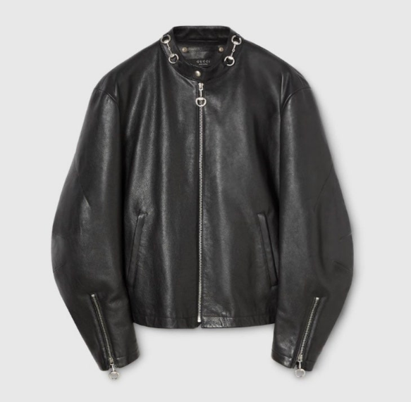 Gucci의 홀스빗 레더 자켓은 칼라 부분에 시그니처 홀스빗 디테일이 더해져 클래식하면서도 강력한