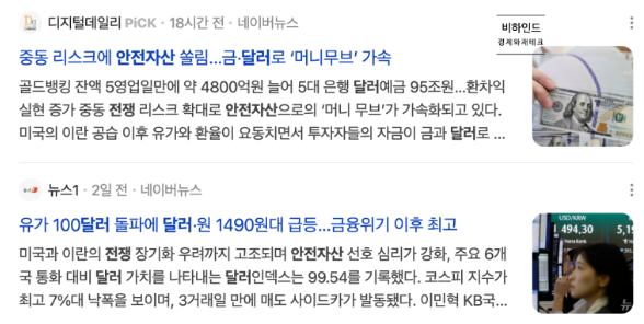 이때 가장 대표적인 안전자산이 바로 달러입니다. 세계 무역과 금융 거래의 대부분이 달러 중심으로 이루어지기 때문에 글로벌 투자자들은 위기가 발생하면 달러를 먼저 확보하려고 합니다. 이 과정에서 전 세계적으로 달러를 사려는 수요가 급격히 증가합니다. 수요가 늘어나면 가격이 오로는 것은 시장의 기본 원리입니다. 결국 달러 가치가 상승하고, 그 결과 원달러환율이 올라가게 되는 것입니다. 정리하면 구조는 매우 단순합니다. 전쟁이 발생 →금융시장 불안 → 달러 수요 증가 → 달러 가치 상승 → 달러환율 상승